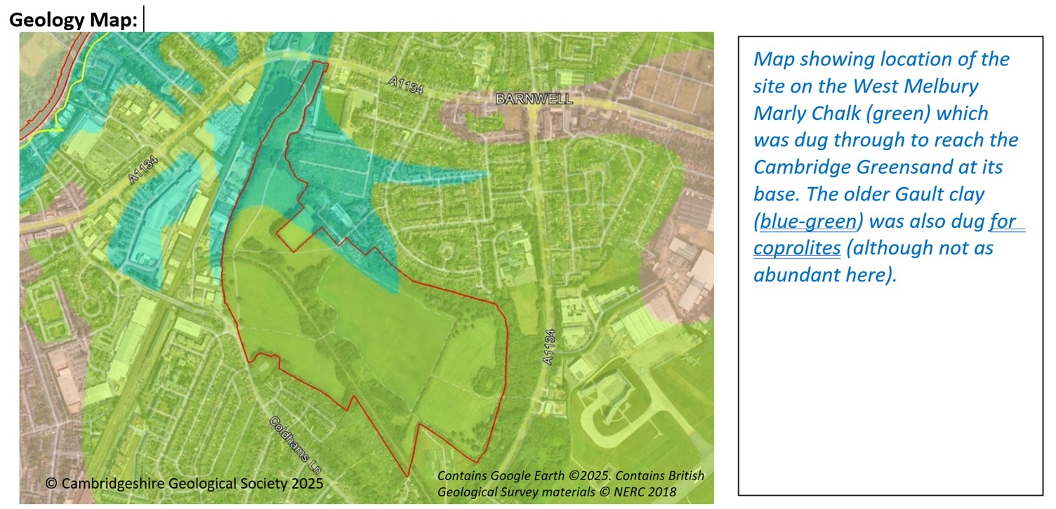 The site was a major area of coprolite (phosphate) mining in the 19th century. Phophate nodules were dug from the Cambridge Greensand, a very localised stratum, present only in north Hertfordshire and Cambridgeshire. It lies at the base of the West Melbury Marly Chalk, itself the lowest, and oldest, formation within the Chalk. The site represents an extensive area where the stratum is near the surface.