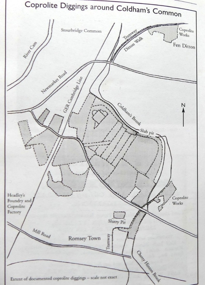 Coprolite mining took place over most of the Common during mid 19th century with surrounding areas used for the coprolite works (see map of historic workings). The site was one of the first in Cambridge to be dug for coprolites and several notable parties invested in it, including the Cambridge Corporation. Works started in December 1954 in the middle of the Common and then expanded to cover most of the site. The brook running along the edge would have provided water for the washing process.